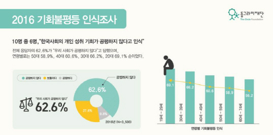 연구에 따르면 전체 응답자 10명 중 6명 가량이 “한국사회에서 개인의 성취 기회가 공평하지 않다”고 답했다. 이렇게 답한 비율이 △10대와 20대 69.1% △30대 66.2% △40대 60.5% △50대 58.9% △60~70대 56.2% 였다.